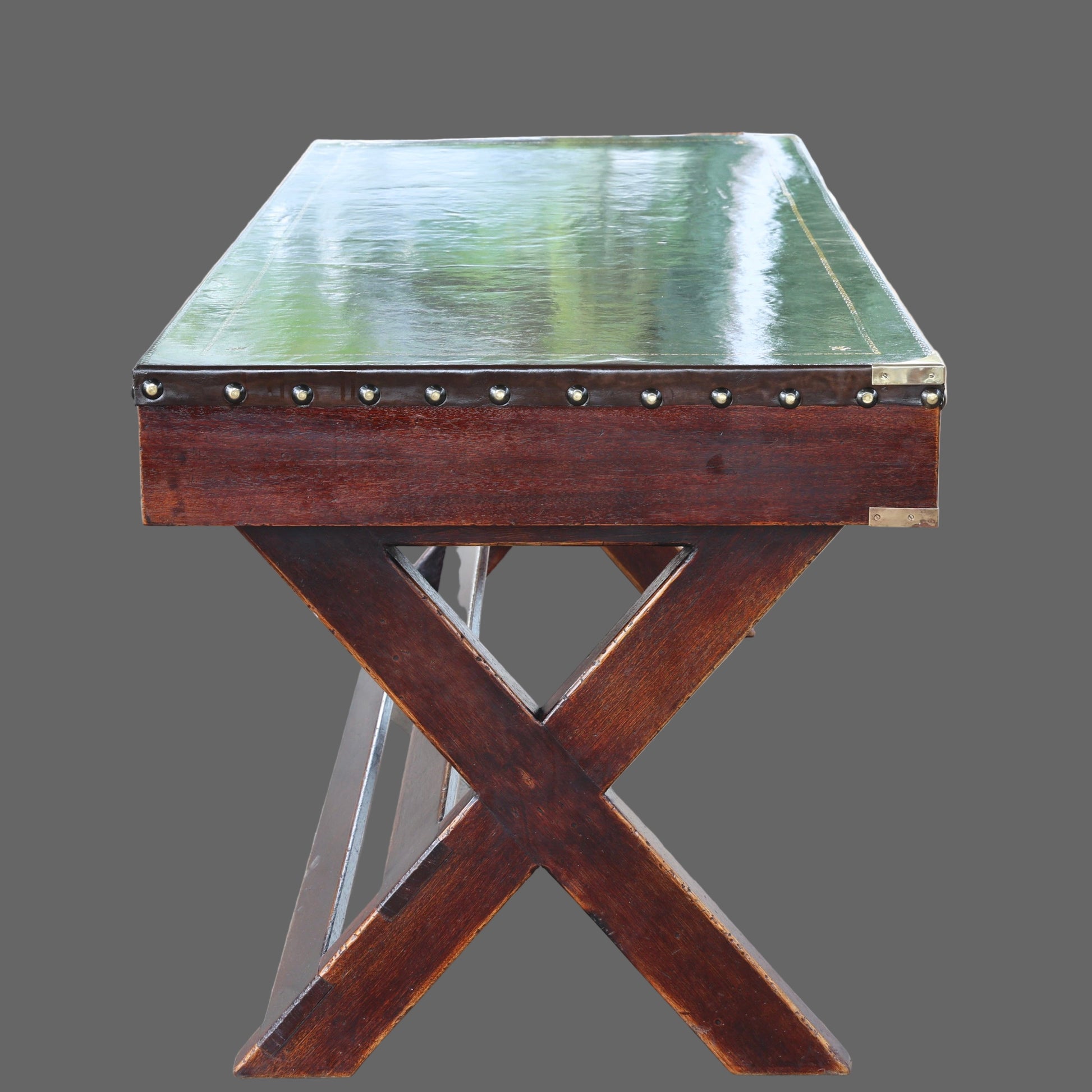 A G2 Mahogany Military style Desk/Writing Table, the tooled leather clad top above three frieze drawers each with inset military style pulls, on twin "X" shaped legs united by plain stretchers,
