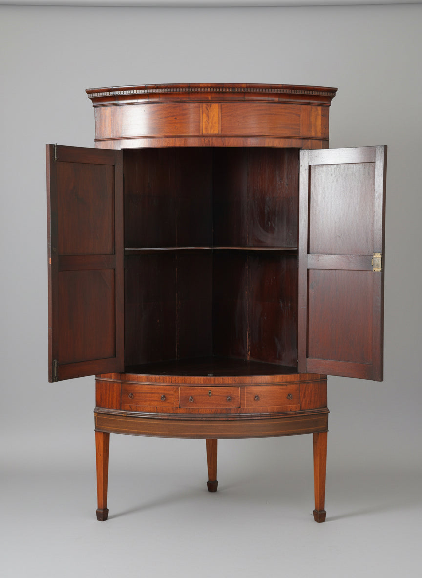 A Georgian inlaid mahogany Corner Cabinet, the outset cornice above two curved doors, which open to reveal a shelved interior, above centred short drawer, flanked by faux drawers, on tapering square legs and spade feet.
